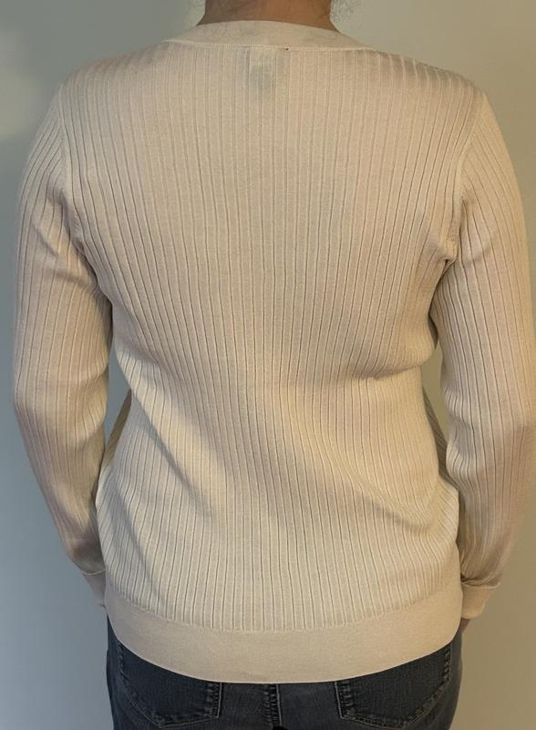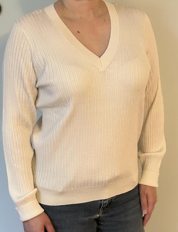 I love this ribbed sweater! The fit is super flattering and the ribbed knit gives it a nice, structured look. The fabric feels soft and comfortable, with just the right amount of stretch. The cream color is classic and easy to pair with anything from jeans to skirts. It’s perfect for layering or wearing on its own. Overall, it’s a versatile and stylish piece that works great for both casual and dressy looks.