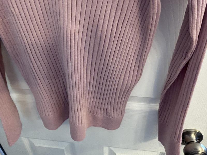 My first thought when opening this sweater is that it was snagged in several places. I couldn’t tell if it was the fabric or if it really is snagged. It’s very thin and poor quality fabric. Also, the color says mauve but it’s a light pink which really doesn’t look great on me. I think mauve is more purple than pink.