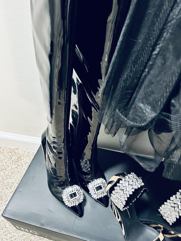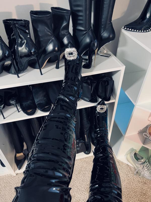 Awesome patent leather, thigh high boot! I have large calves and thighs and had to maneuver when pulling them up, but a lot of that was due to the stickiness of the patent leather. The inside is soft. Wish the zipper went all the way up. Great dupe with the jeweled topper for the Muaddi boot. They fit over the leg and I was able to stretch them right over the knee. They did not fit to the middle of the thigh.