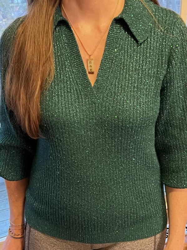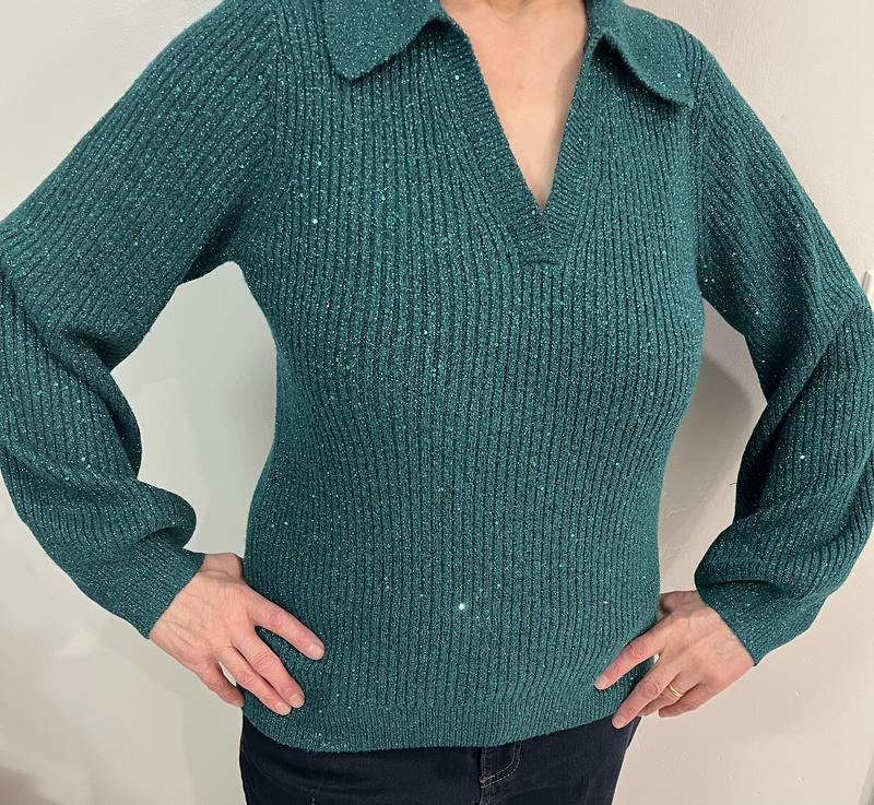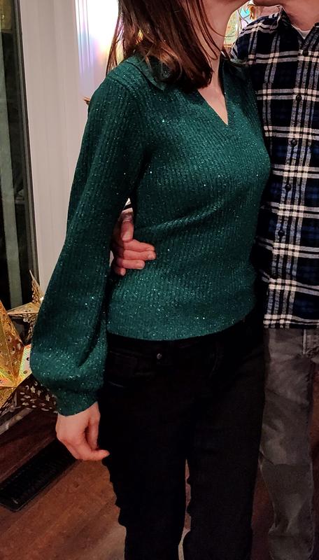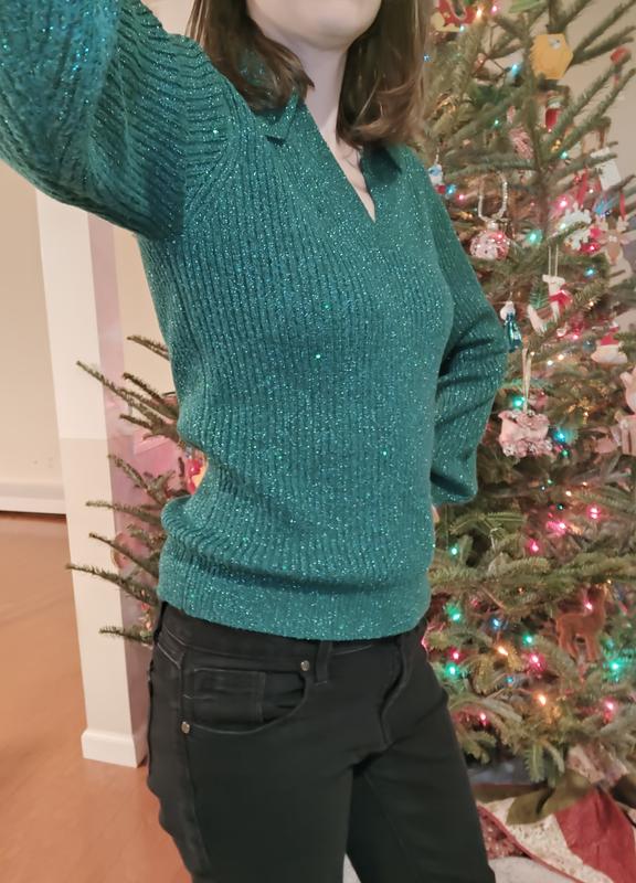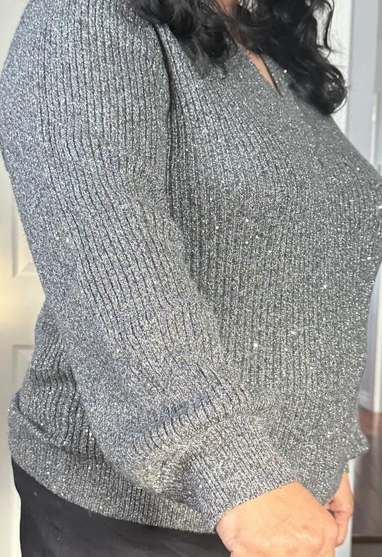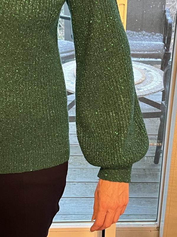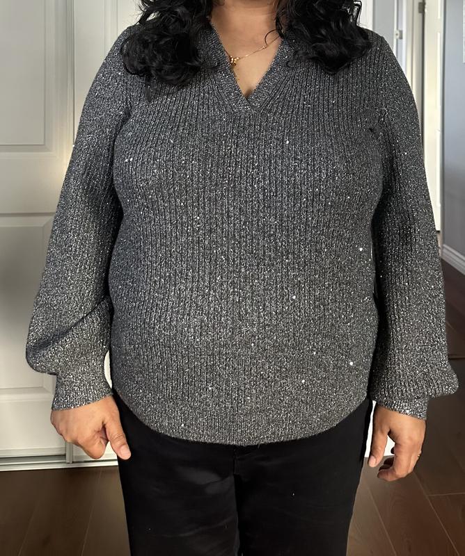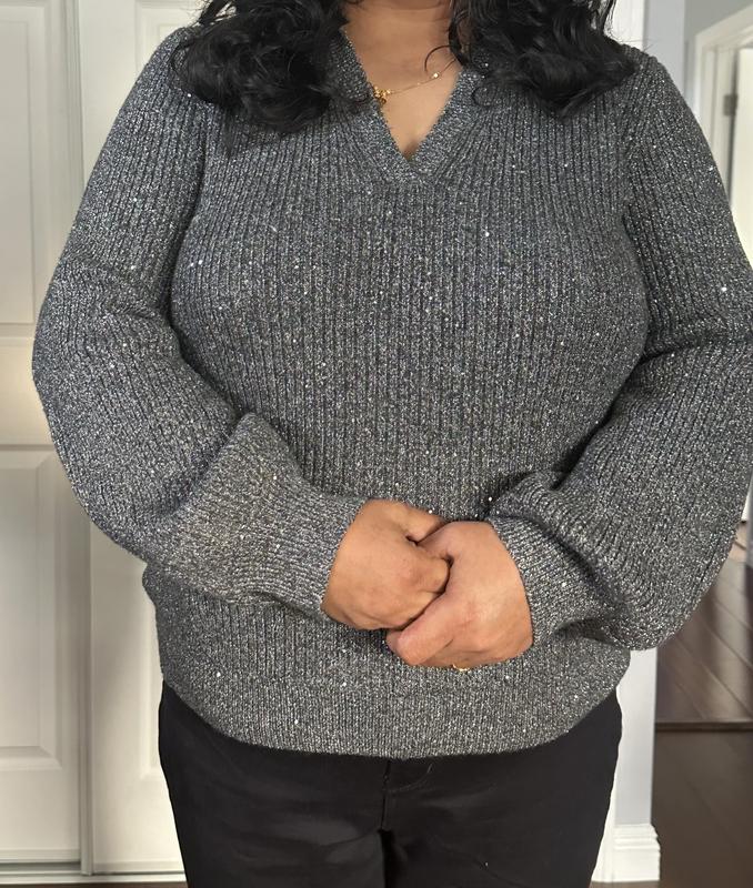 Very happy with this cozy beautiful sweater. It has just right amount of sparks. You can achieve casual or more dress up look. The sweater is true to the size, but the sleeves are a little bit too long. It is washable which is the big plus for me. I see myself wearing it a lot.