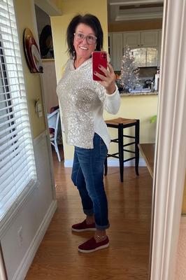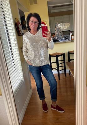 Another fun to wear sweater for anytime, not just the holidays. The back is a sweater without sequins.
