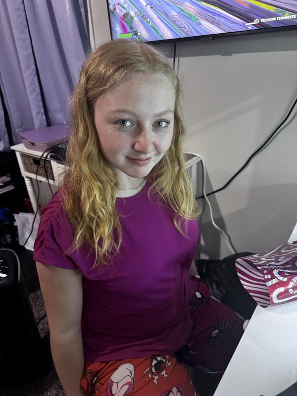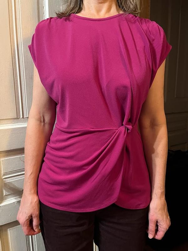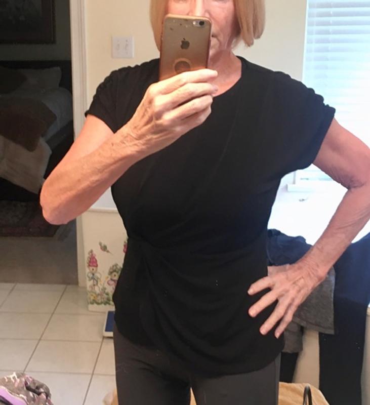 This short sleeve twist front time is stretchy, very comfortable and flattering. I normally wear a sz L, but the M fit me perfectly. The color is beautiful and the twist front hides a lot. I only got this top, so I haven’t worn it out yet, but my family loved it on me.