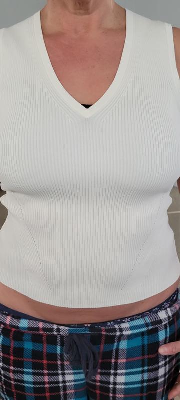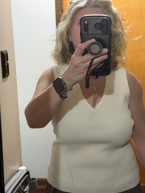 Great sleeveless sweater. The fit was perfect and true to size. The cut of the sweater is very flattering. The length is just right. It isn't too short or too long. This sweater would work well with dress pants or with jeans. It is lightweight and comfortable. It is a soft cream color.