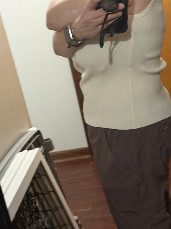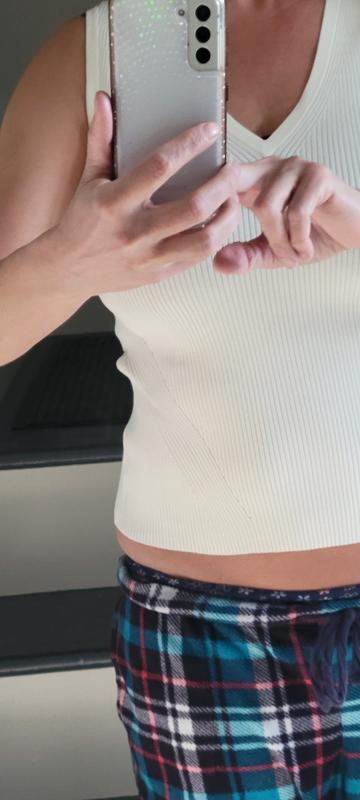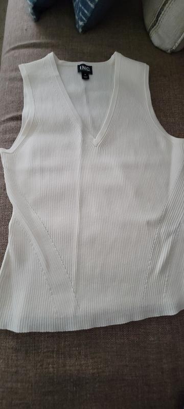 Very classy light blue sweater by INC. I wish it were a tad longer but overall a good length. Would be great to wear under a blazer for a pretty pop of color. The sleeve fits really well and doesn’t bulge which is a huge plus. The v neck is a nice cut and isn’t overly revealing. Overall very nice sweater tank.