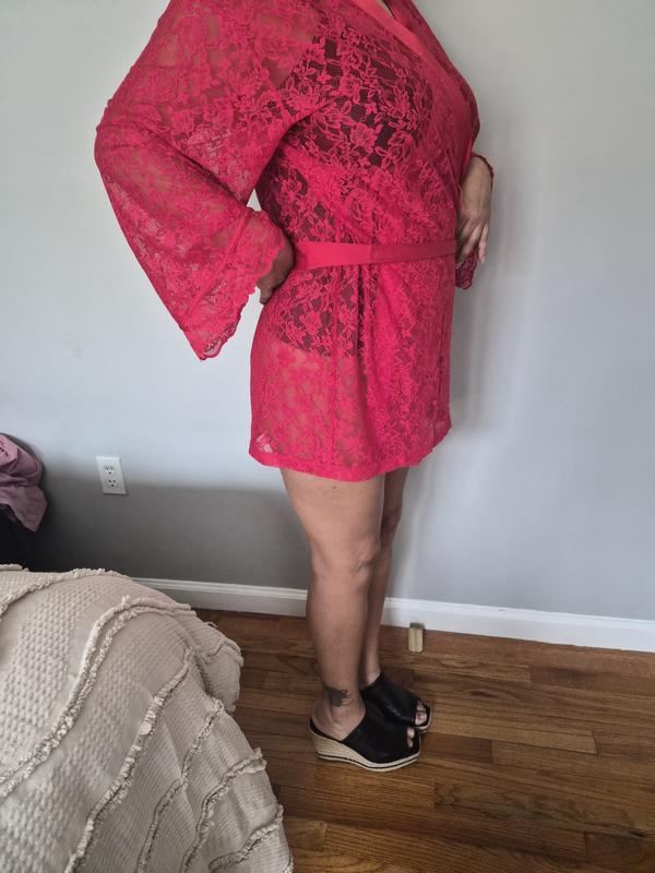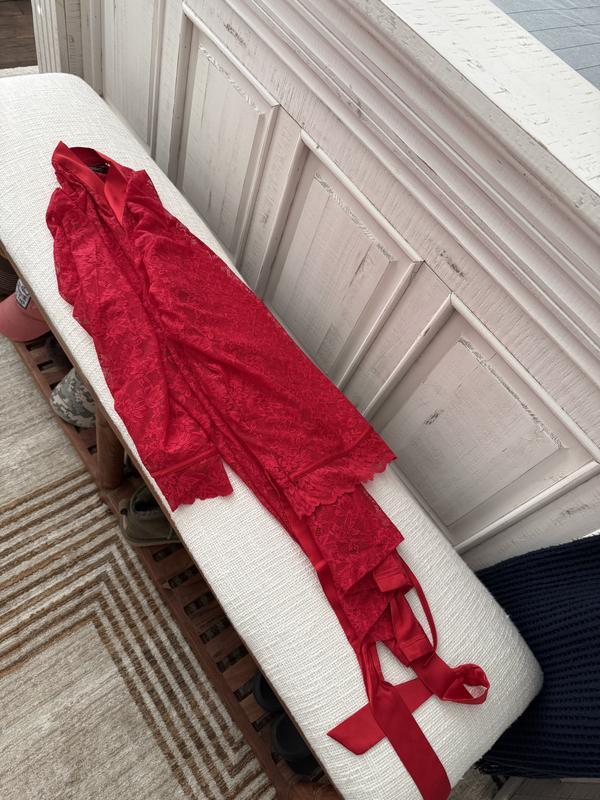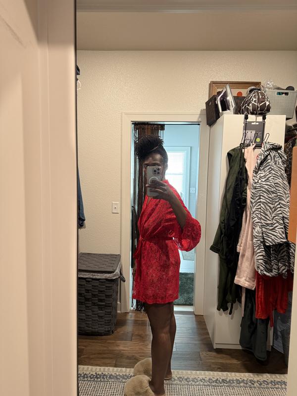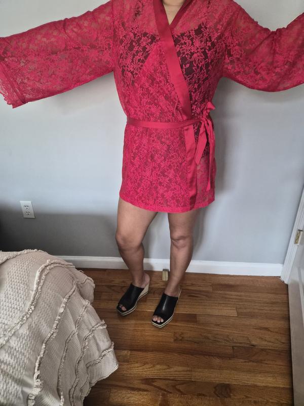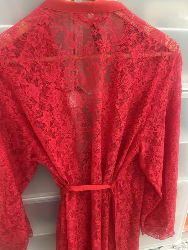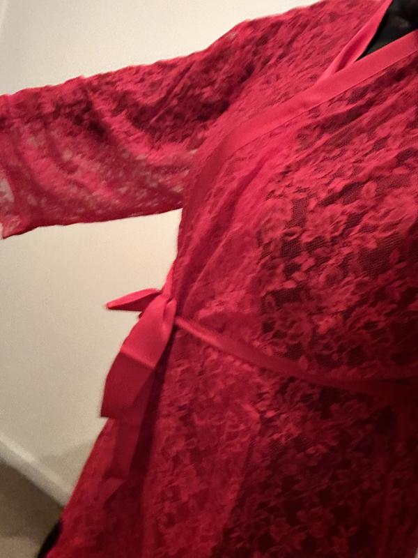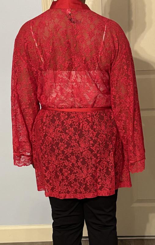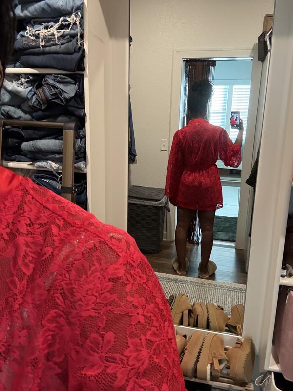 This robe fits solidly in the “lingerie” category. It is not everyday night clothes. It’s bright red and well above the knee. The robe is all lace, which means it hides nothing. The fabric is soft and has a nice feel to it.