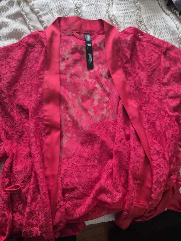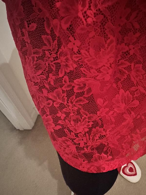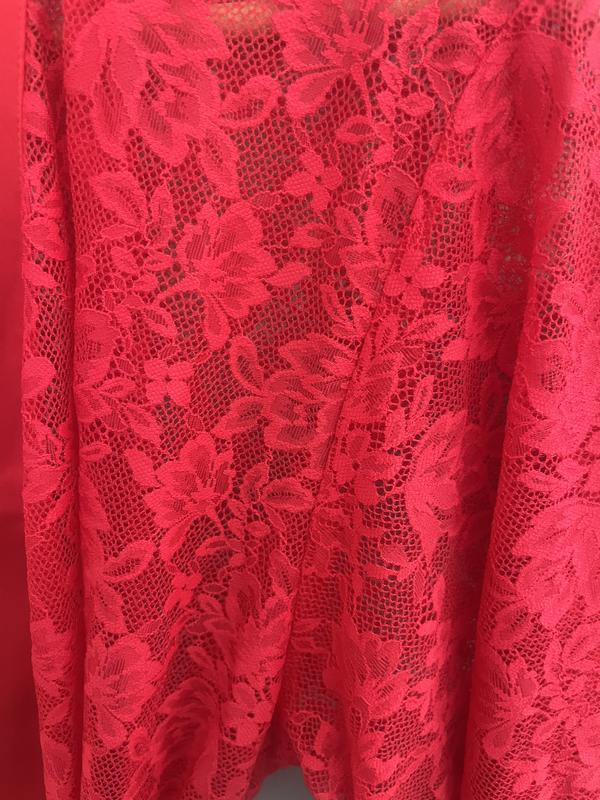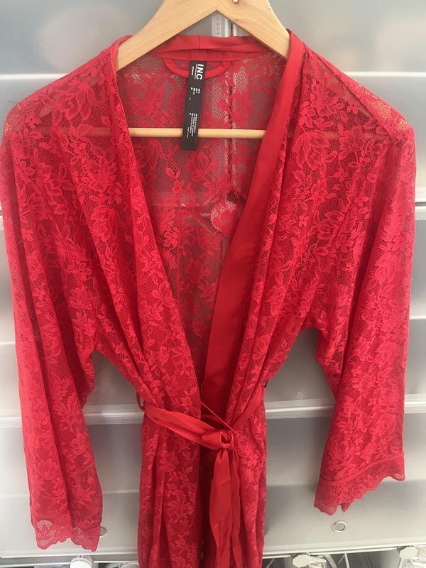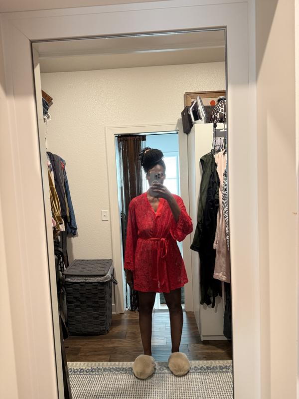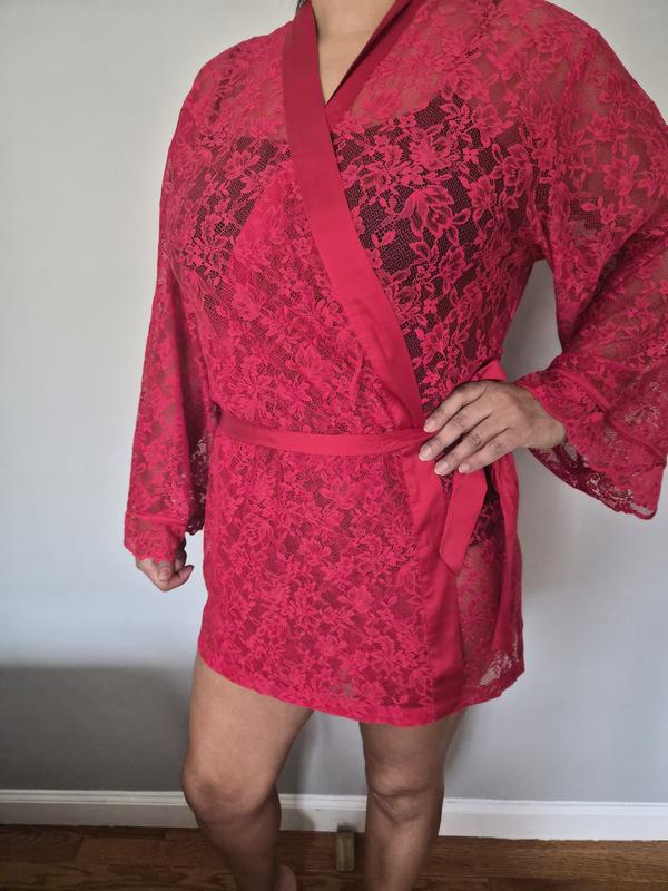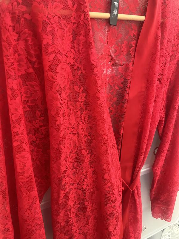 This robe fits solidly in the “lingerie” category. It is not everyday night clothes. It’s bright red and well above the knee. The robe is all lace, which means it hides nothing. The fabric is soft and has a nice feel to it.