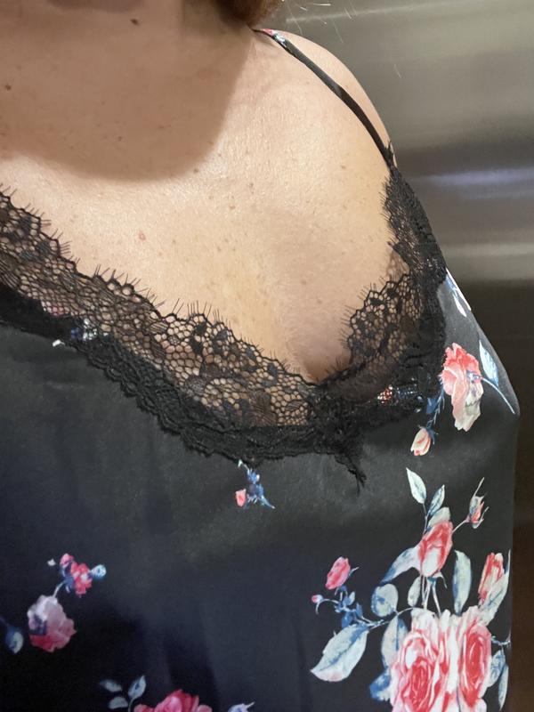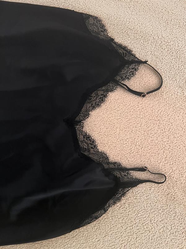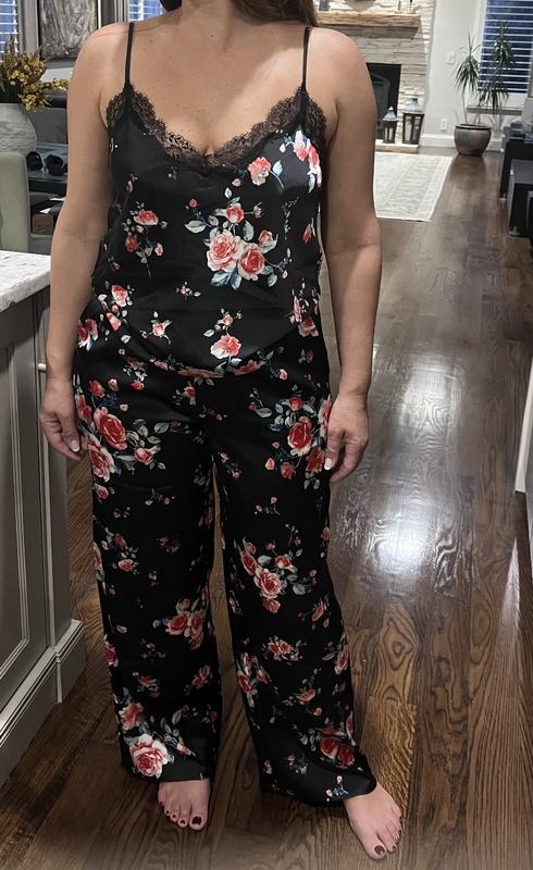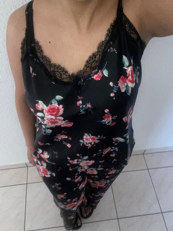 I don’t usually wear pjs that are not cotton but I liked this set. It’s a classy pj set and the black is shiny with some lace around chest. I love the adjustable straps. The pants have pockets which is a huge plus. The elastic part of the pants is only in the back so it looks even nicer in the front. I usually get large to be comfy in my pjs but this large seems to run big. I recommend this pj set if you like silky pjs. High quality.