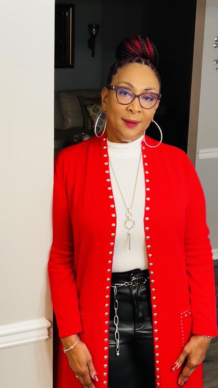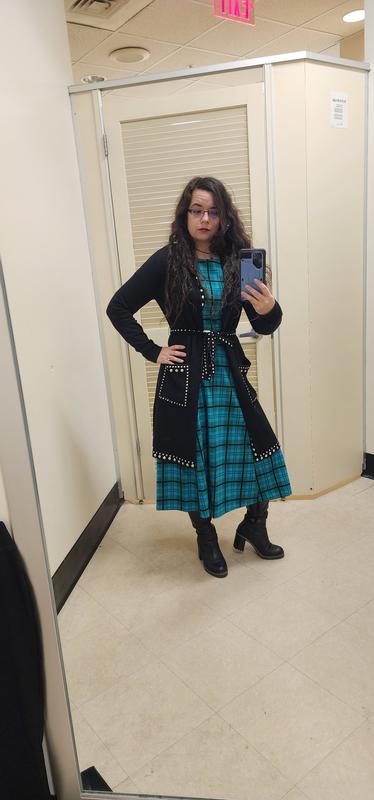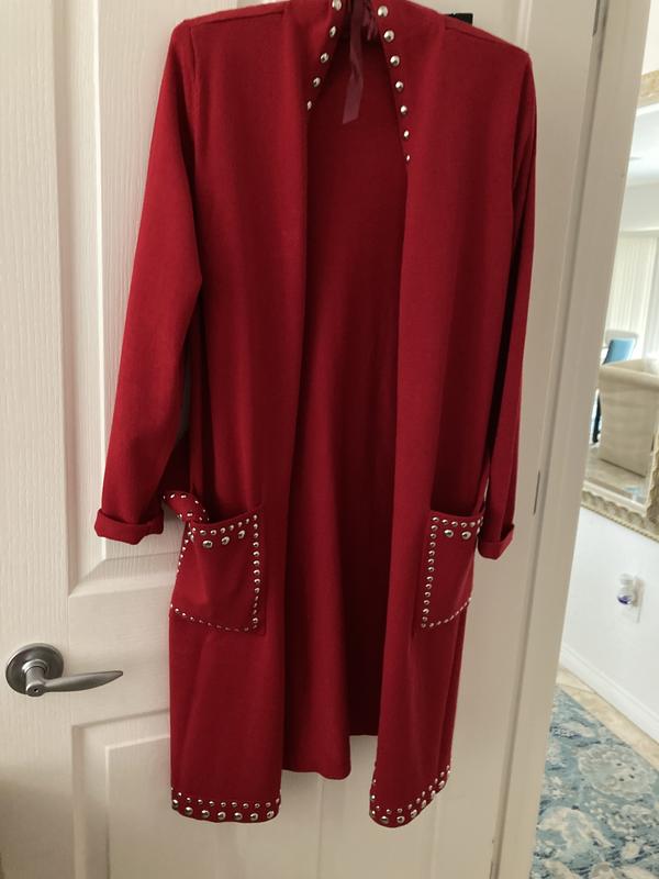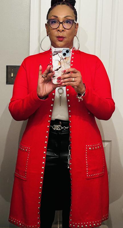 This cardigan looks and feels amazing. I have gotten so many compliments on it. It fits well and has a great shape. Love the studded edges. I am a size 12 and bought a large and it fits like a dream.