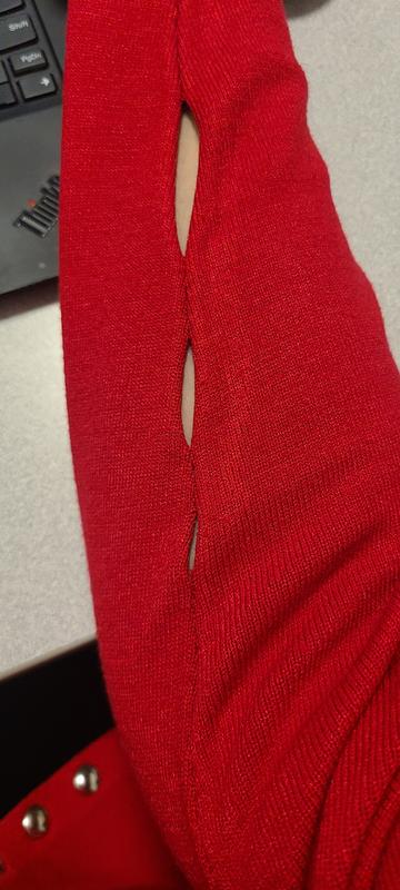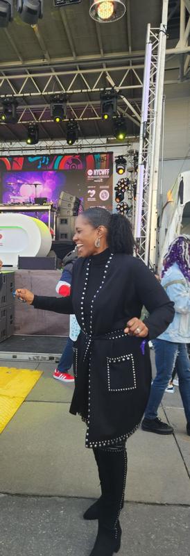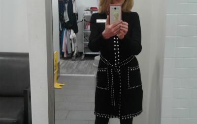 This Cardigan is show stopping in the black with silver studs. I've received numerous compliments on it. It has a good thickness and flattering fit. I highly recommend this piece.