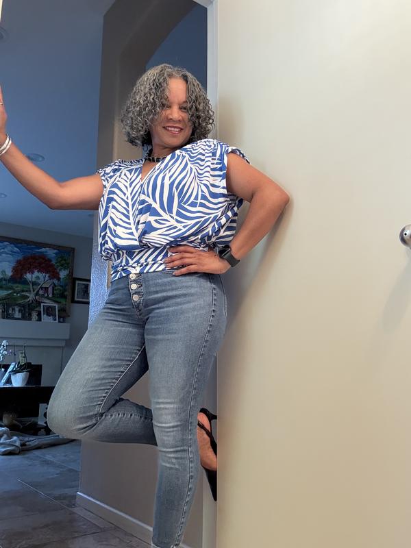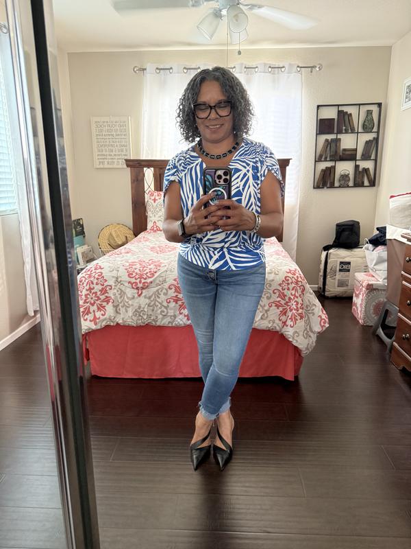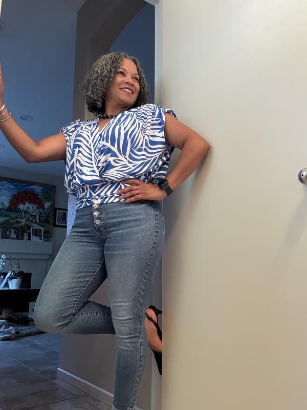 I had bought this top before in black and white. I love the style. I just bought it in 3 more colors, solid green, a blue and white print and a leopard prints.