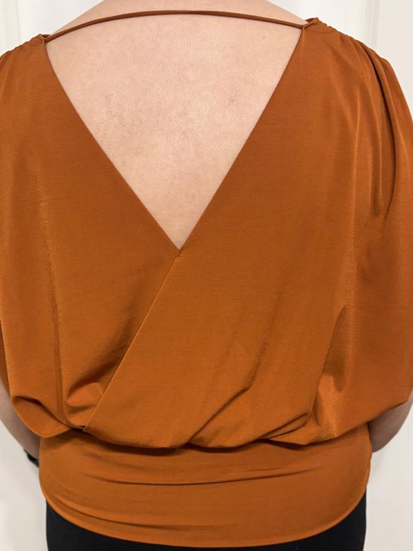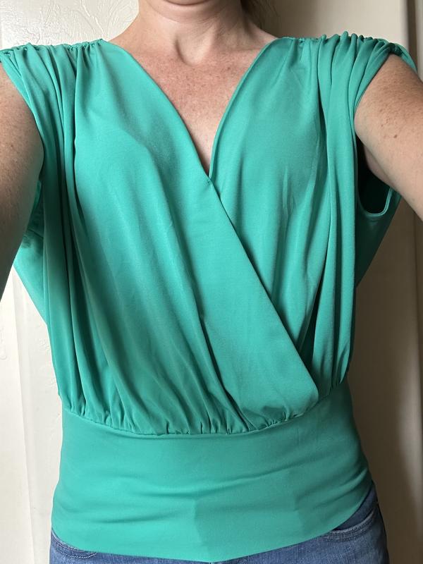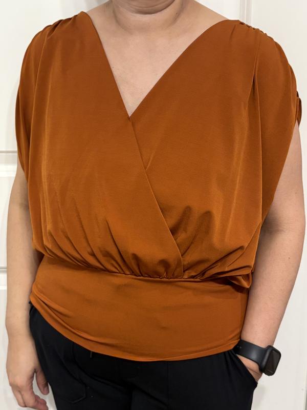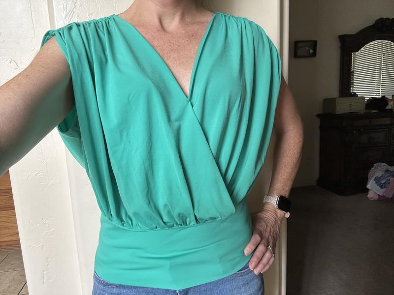 I had bought this to possibly wear to an event but chose something else. Decided to keep it cause one can never have too many black tops 😄. It runs big so bought it in a smaller size and looked much better. It's nice and dressy looking and love the draping and detail. And with it being on sale when I purchased It's a keeper.