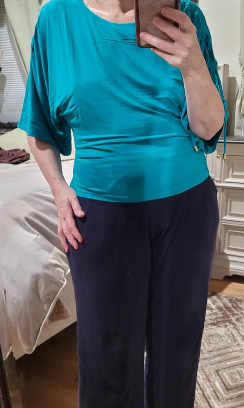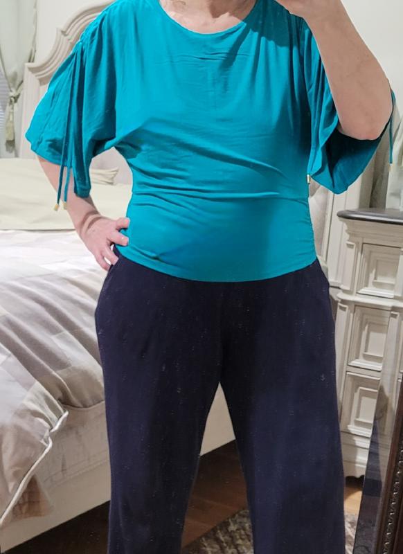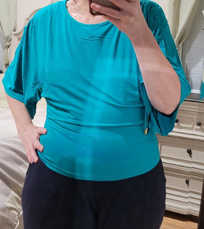 Great top with ruching at the waist and shoulders which elevates it for wear from casual to dressy. Pretty green color that works well for all seasons and goes with white pants, blue jeans, black pants. Modal knit fabric has a nice weight and drape. The neckline and sleeve length provide good coverage. Pretty gold metal caps on the end of the shoulder ties is a nice embellishment (but they might be annoying if you are dancing!). I found myself adjusting the neckline to keep the shoulder ties balanced. But that is minor for this cute, comfortable top.