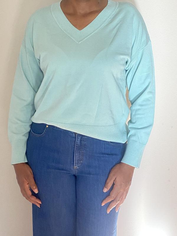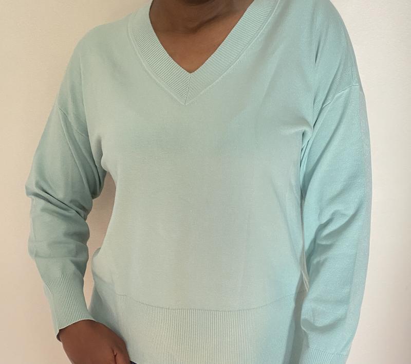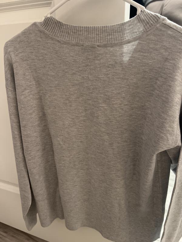 I love this sweater. V neck, which is hard to find, so flattering. I bought it in black. Great length for taller frame, I am 5’8”.
