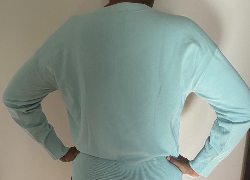 Comfortable fit, the neckline is not too low, and the knit is very soft.