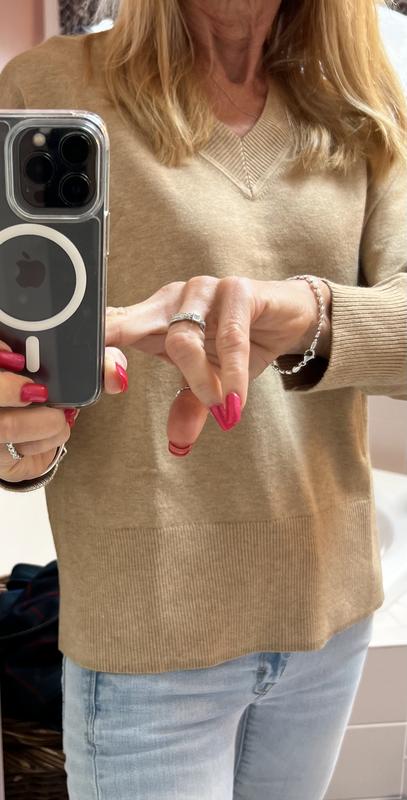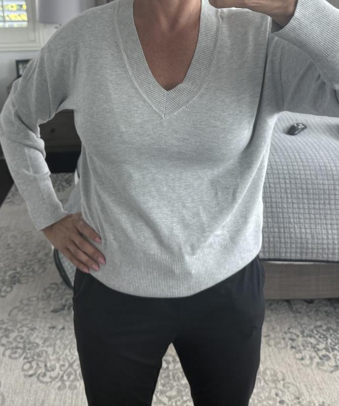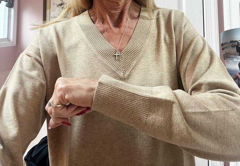 The good….the color, the feel, very soft, the quality. This is not another garbage sweater that is going to pill. The bad….the fit is not as straight as it looks in the photo. There is a rather large band at the bottom. It grips the body in an unflattering way. I’m 5’3” and it grips the top of my butt. The overall shape when you raise your arms is the batwing look. I also tried sizing up but the grip is still there. This is a thumbs down for me (broad shoulders and narrow hips). Returned.
