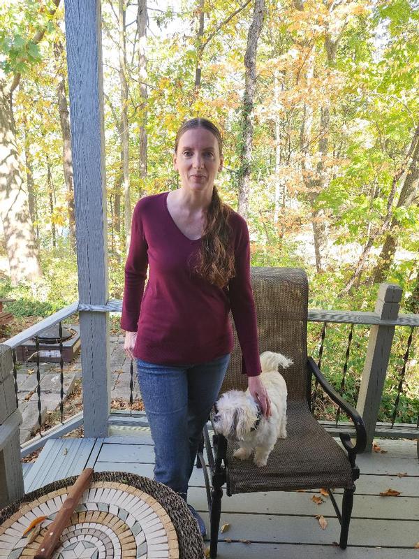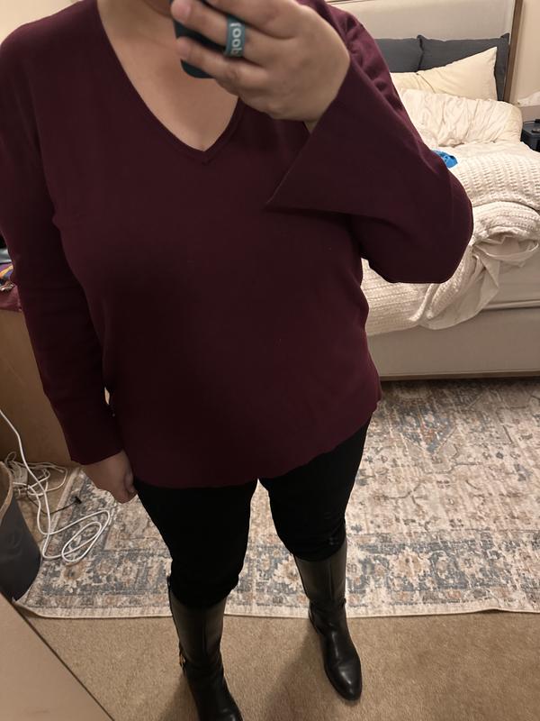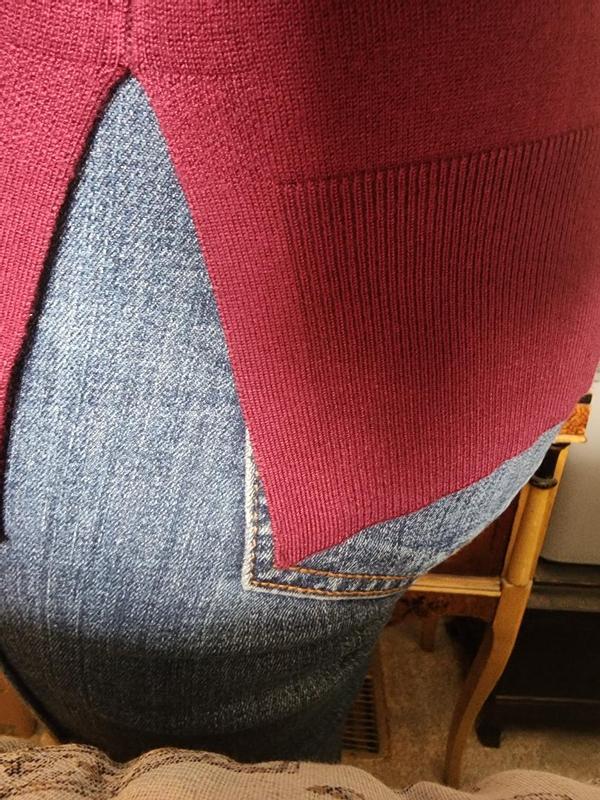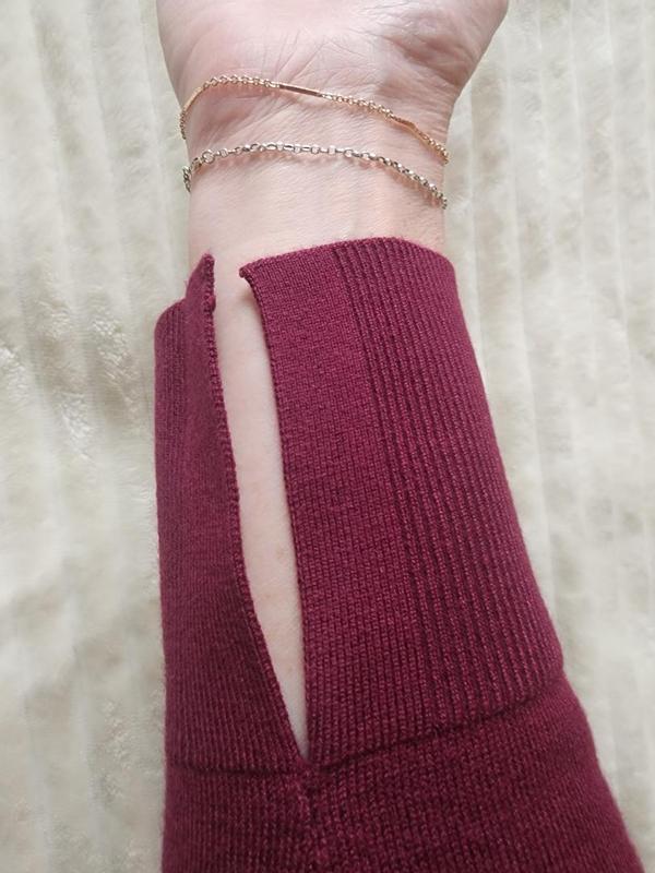 A classic tunic sweater that will pair nicely with blue jeans, leggings, dress pants... you name it. The fabric is soft and drapes very nicely. I think the length is just perfect with just enough coverage on the bottom and the feminine v-neck to showcase my favorite necklaces. There is a unique slit at the cuff, which makes the sweater a little different and stylish, but a little challenging to pull your sleeves up.