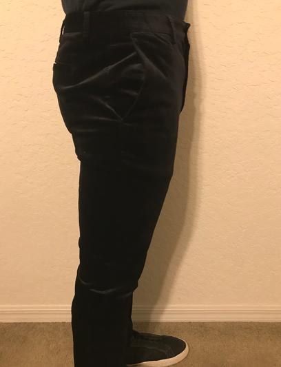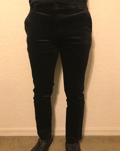 These black velvet trousers by INC were easy to wear, not too fancy and had fashionable narrow bottoms. They fit well and comfortable plus there were no bad seams. The velvet is nice and a good deal at the price that I think they will be marketed at. PS my wife loved them!