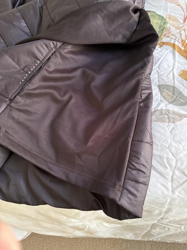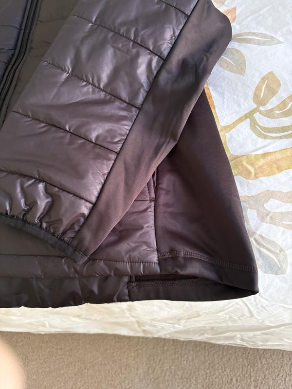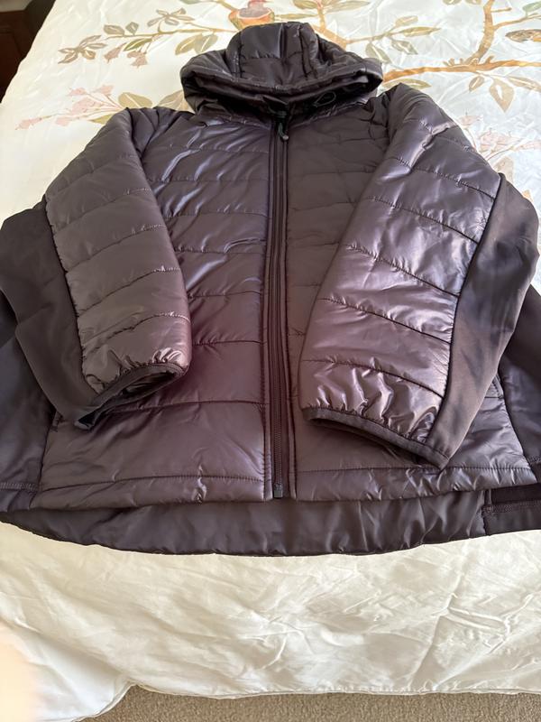 This puffer jacket has a average quality feel to it. The sides have a little give but more room is needed. I can say that I like the side design on the jacket. Ordered the jacket in a 1X under the assumption it would be larger so i could wear it with sweaters and hoodies for the winter. Nope it runs small in my opinion and I would worry about the zipper splitting if I wore a thick sweater or hoodie. Overall, I wasnt really impressed with this particular jacket.