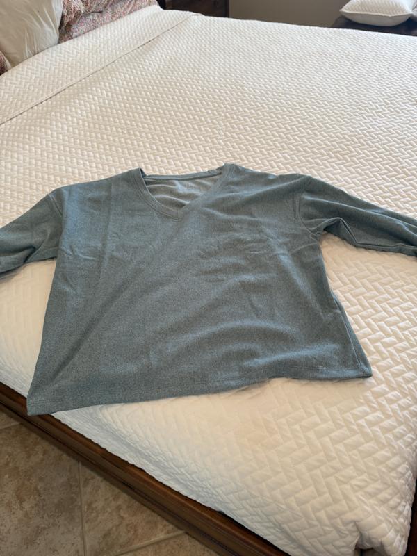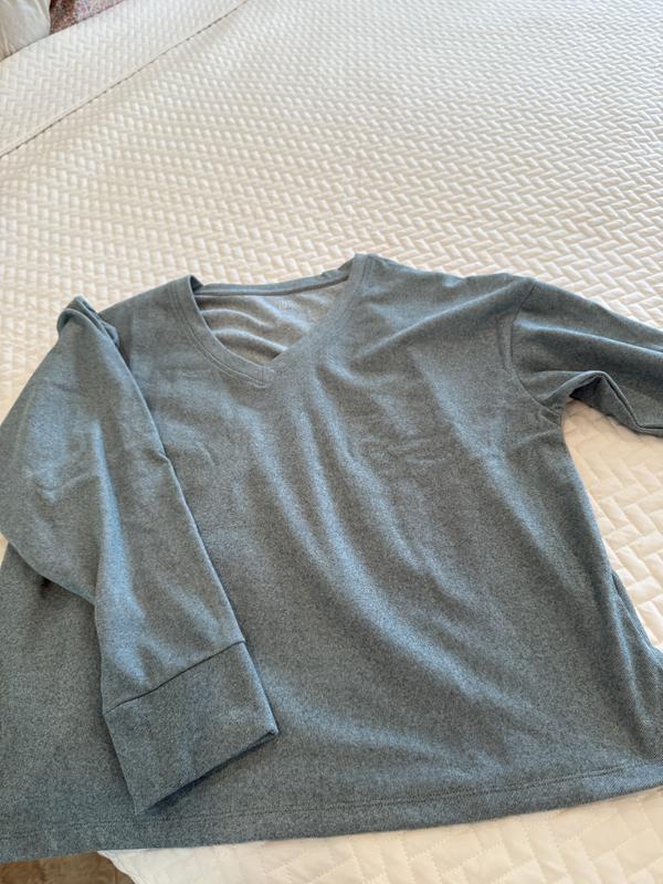 Absolutely love the feel and color of this V - neck pullover Drop shoulder long sleeve loungewear with thumb hole cuff Chick casual can wear around the house or run to the store wearing this sporty pullover