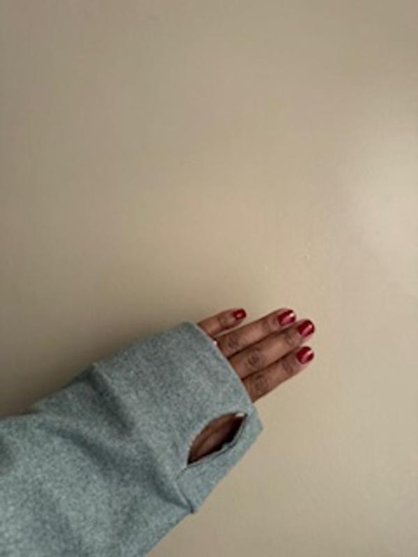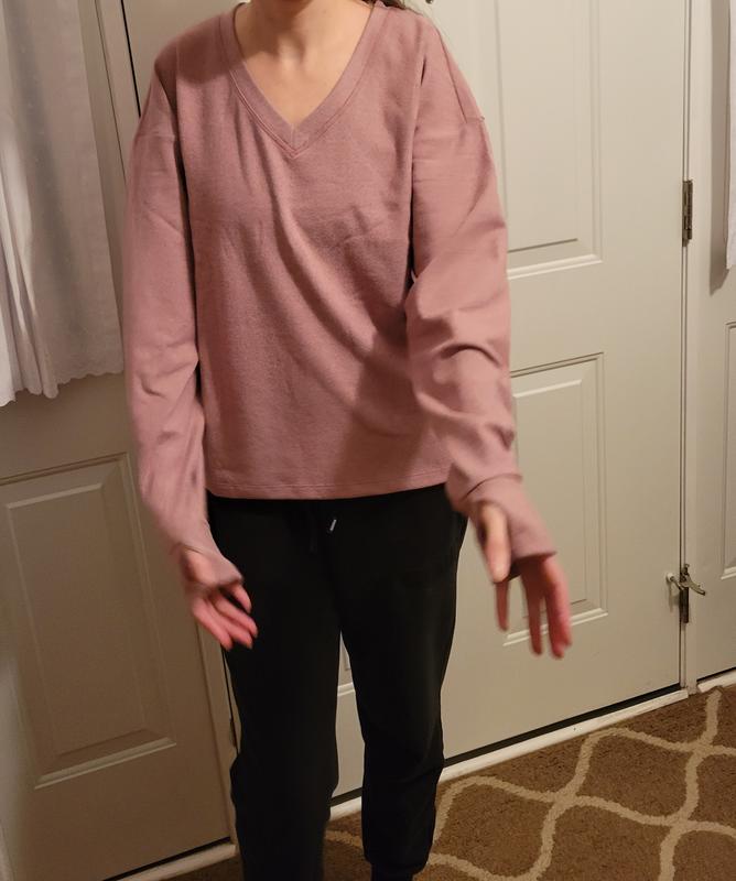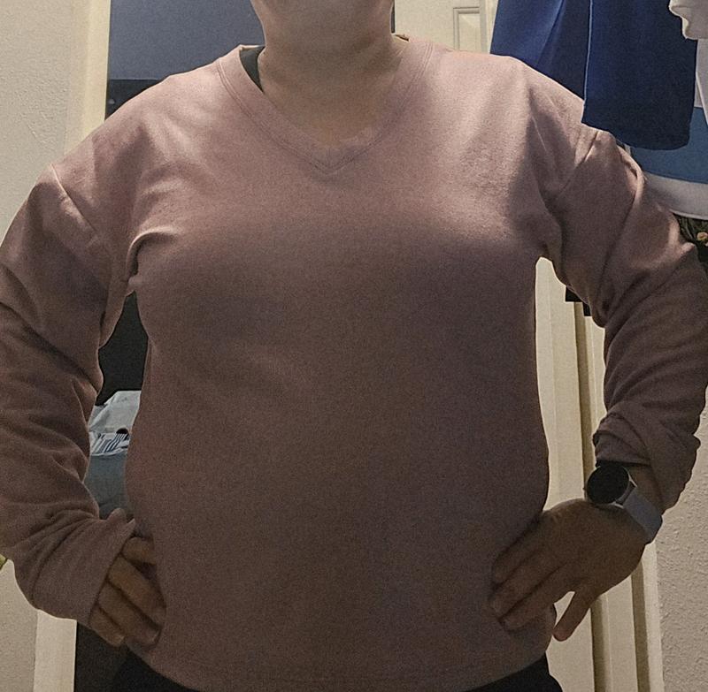 I was very pleased with how plus feeling and soft this sweater is without feeling bulky. The thumbholes are soft and don't hurt my hands. The v neck was flattering on me and I found it great for the cold