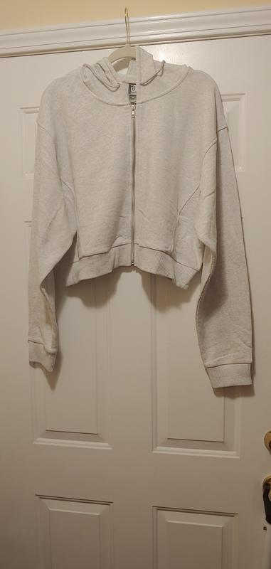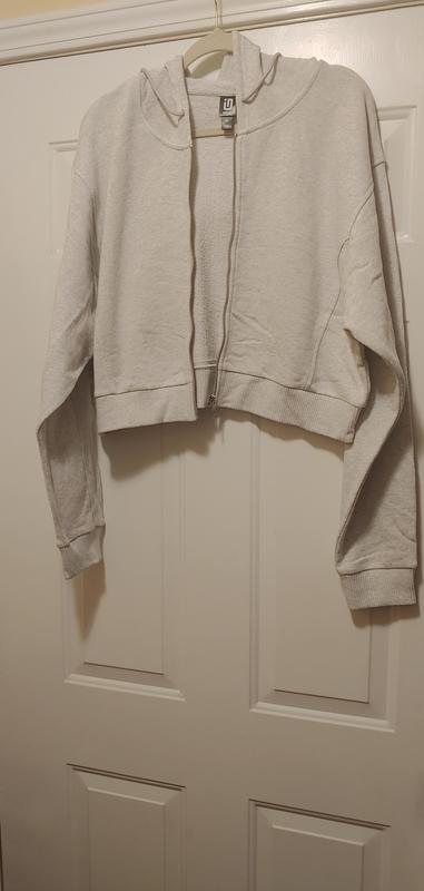 Cropped as described, I sized up for a loose fit. Runs a bit small. Fabric is thin and the zipper feels low quality. Purchased it on sale.