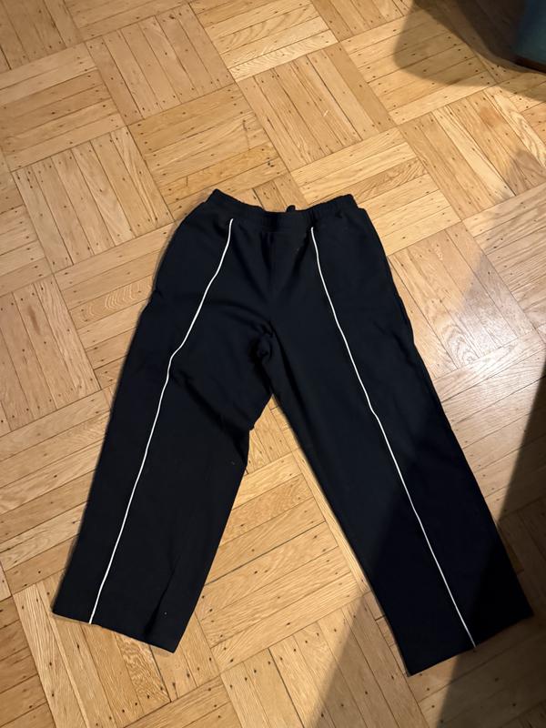 These pants are perfect fit. Very true to size. Nice elastic waist. They have lovely side pockets. There is no draw string in them but the nice. One stripe down each leg. They wash well. Did not fade.