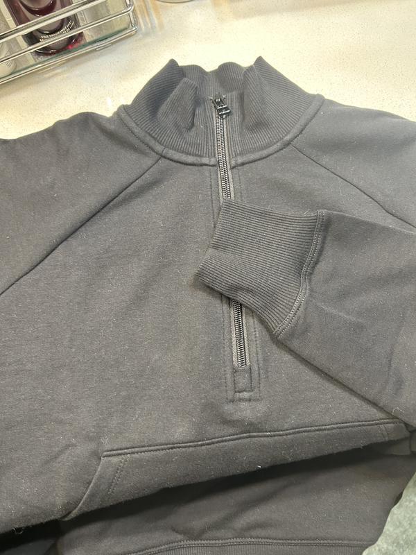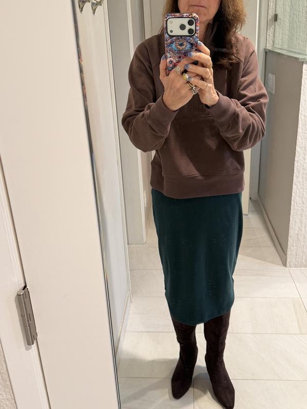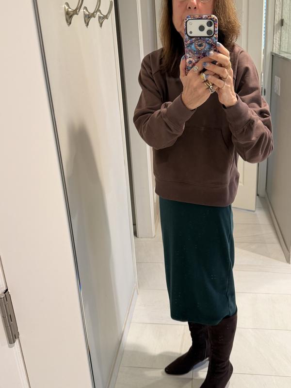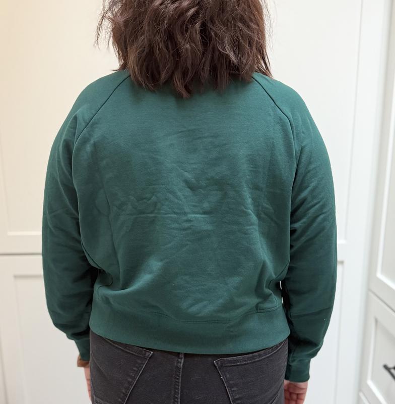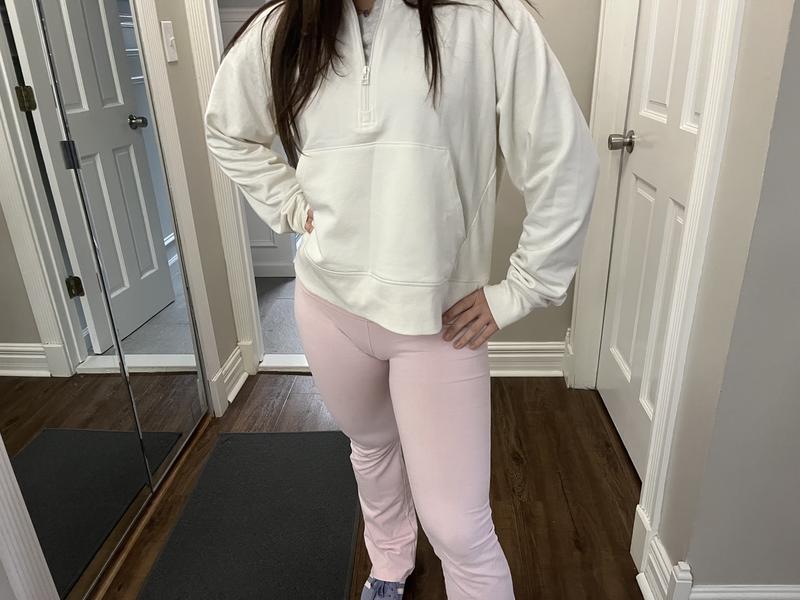 This sweatshirt is very soft & cozy. The quality of the fabric is great and the color is beautiful. My only con is that if you are tall ( I’m 5’9”), it’s quite short. It’s almost like a cropped length. The sleeve length is alright. Could be a little longer.