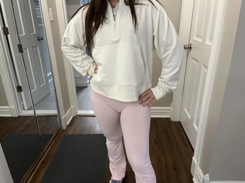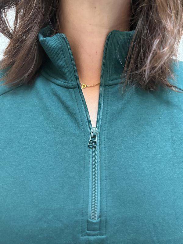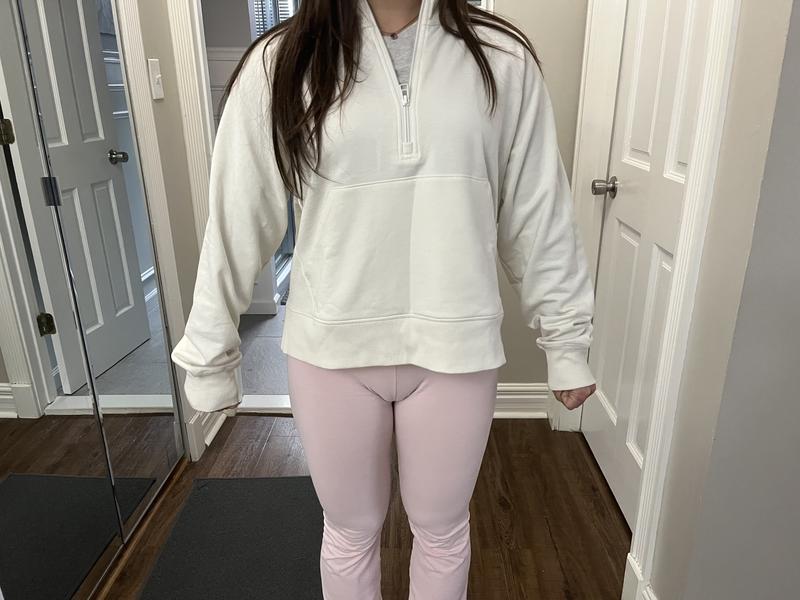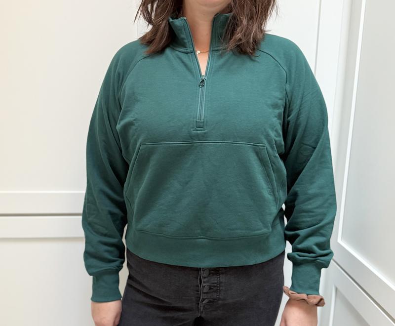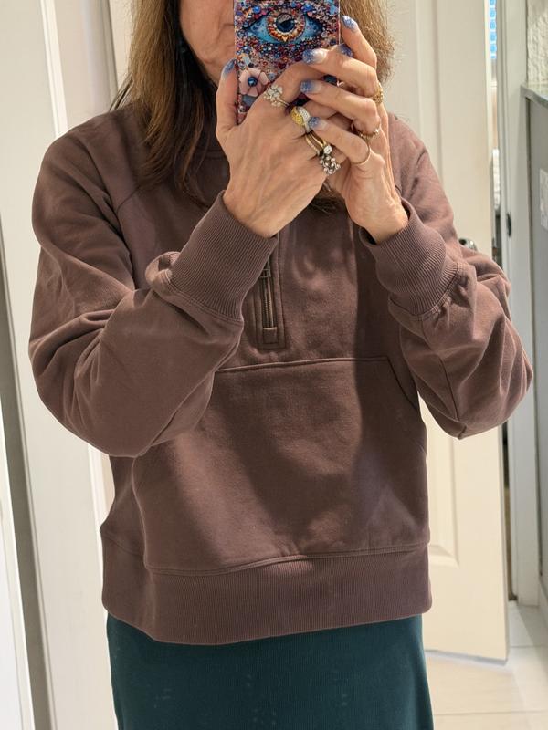 Awesome light quarter zip sweatshirt! The length is perfect. Love the width too, not tight or boxy. You can wear this with athletic wear or with a pair of jeans. It is very versatile. The color is beautiful too!