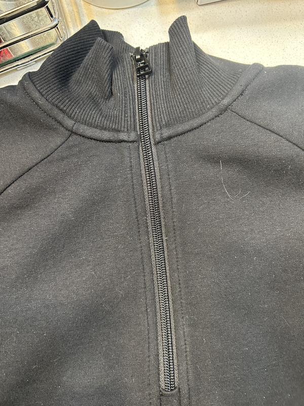 This is a lightweight fleece quarter zip. It has a boxy fit-the bottom ribbing is not tight at all. The zipper is the same color as the top which is a nice detail. The sleeves are plenty long. The brown color is not a rich chocolate-it’s got some grey in it. It’s sewn well. I’d give it 5 stars if the material was a bit thicker and if the bottom wasn’t so loose. On the other hand, I know a more cropped, boxy fit is on style so that may be your preference. Overall it’s a decent staple for warmer fall days.