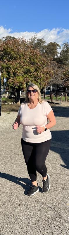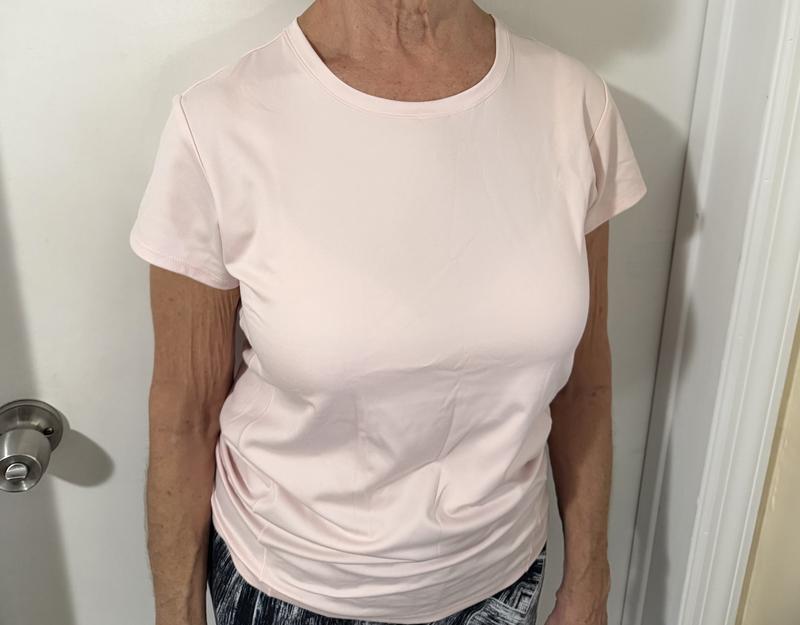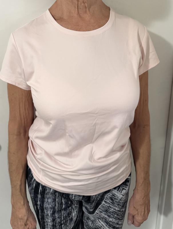 I love working out in this shirt. It has good moisture wicking qualities that make it so much more comfortable for me. I got the chalk pink color and it really is a very subtle pale pink color, from a distance you can’t tell if its pink or white.