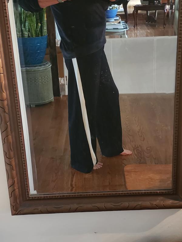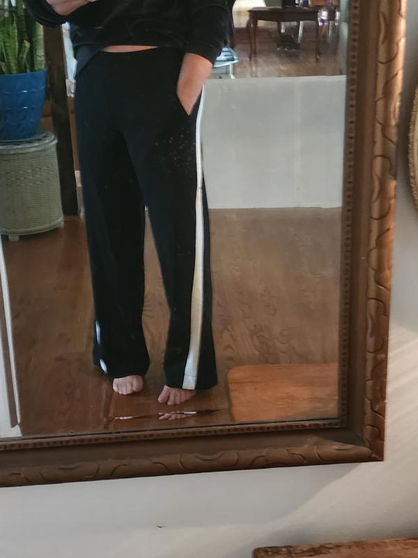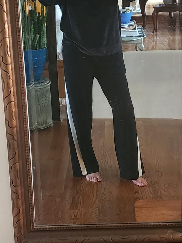 Lovely pants. Not a sweatshirt material. More of a scuba knit which I like with a slicker inside feel. I am 5'4" and you can see the length with no shoes. Many sweat pants now drag the ground which I hate. These have a wide stripe that wraps the leg for a slimming effect. Slip pockets. Elastic waist. I normally wear an XS in pants or jeans and although these fit I would like to have gone down to an XXS. These do have lots of stretch and nice quality. I think most people will love them.