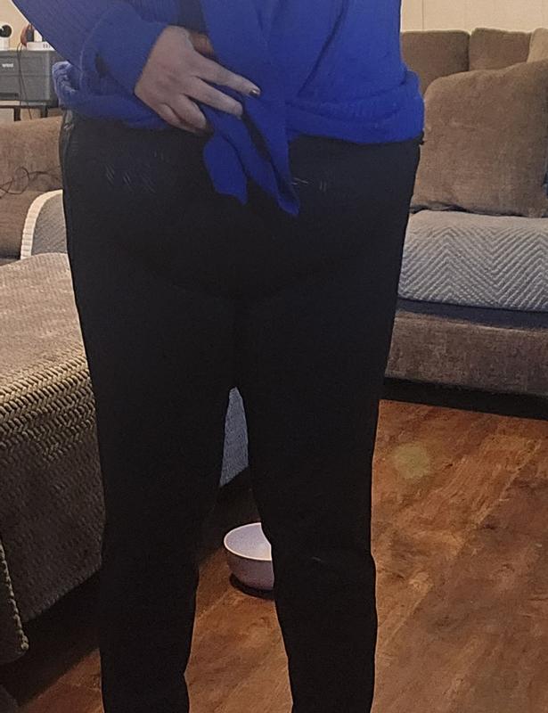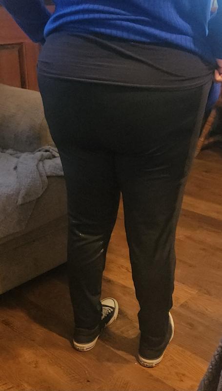The black workout pants are very comfortable. I usually wear an 8–10 or a medium size. I ordered a medium and they were a little loose. I could have sized down to a small. They have very interesting detail with some shine pattern and side the pockets for your phone or other items. The material was great and not see-through.