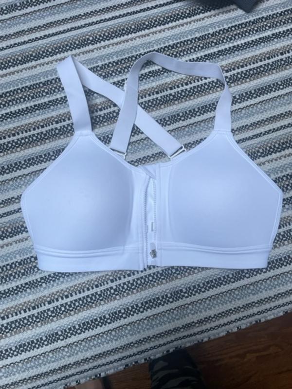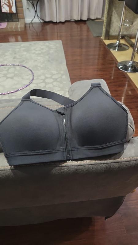 This bra has good support for light jogging and is easy to put on. I don't agree with the negative reviews about getting in on. I also did not have a problem with the zipper coming undone. It's secure. You just have to clasp the front together, pull it over your head, and then zip up. I like the style. I have very narrow shoulders and this bra stays put when I exercise. The only reason I gave it 4 stars instead of 5, is the thread is a little bit itchy on the sides - but I have super sensitive skin.