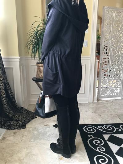 I love this hooded wrap, it was exactly what I needed for the fall. I can wear it around the house, looks great with leggings, and also is great for when I am running out the door to get my kids from school or a grocery store run, it is extremely versatile and super soft and cozy. I like the elastic, I can pull it tighter or leave it lose depending on what I am wearing, it looks great with tall boots too!