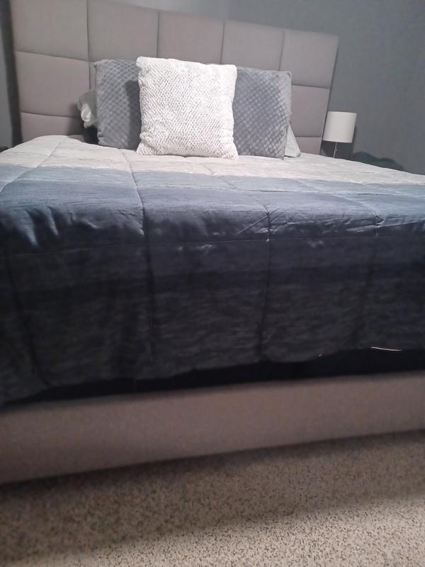 This comforter came vacuum sealed and it is so flat and thin it looks cheap. The colors are not as they appeared in the pictures and description. The colors are mainly blue and tan and the back side is the grey color. I was really excited about this but I will be returning it.