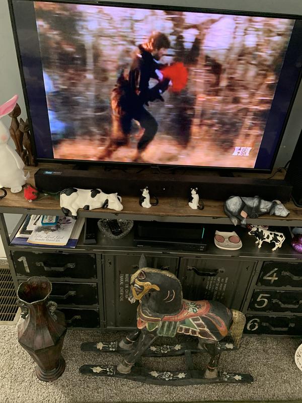 Put the soundbar on the wall and it works great! Love the sound for movies and sports. Great addition to the entertainment center.
