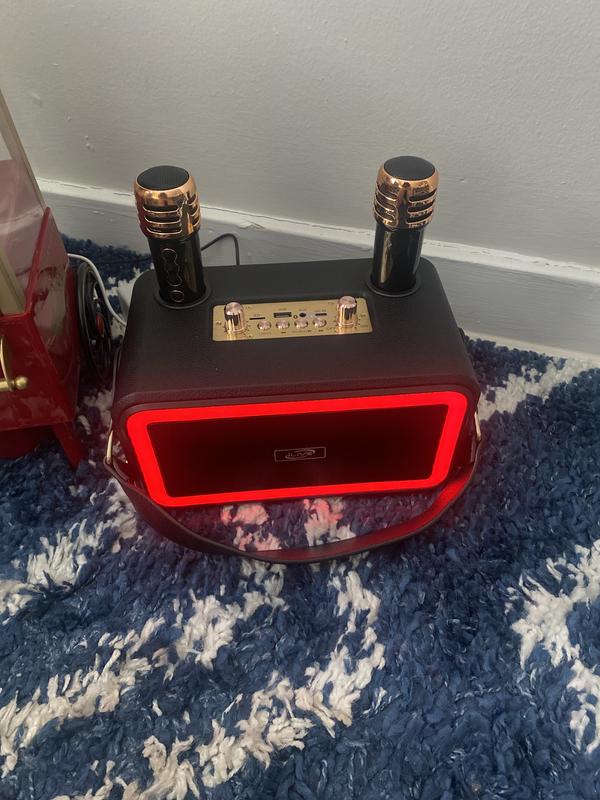 This is an extremely well crafted Karaoke Machine that comes with 2 microphones! The sound quality is clear and there are many options of things that you can do with this machine! The neon lights on the System are cool and the kids love it!