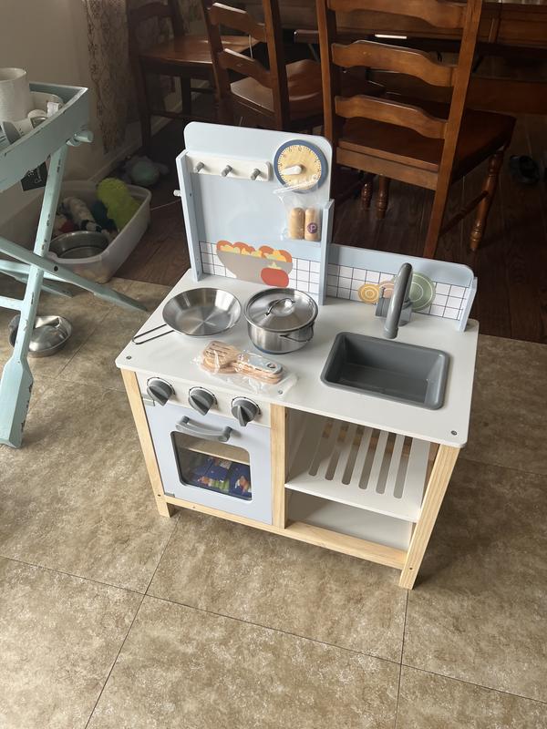 We love it- my mom really wanted to get my kids a play kitchen and this one fit the space perfectly! It’s so cute and doesn’t clash (we have it in the kitchen so the kids can play and cook while mom cooks). It was about medium difficulty to set up (easy at first but gets more difficult its parts need to fit in as you go). But now that it’s all set up it’s perfect