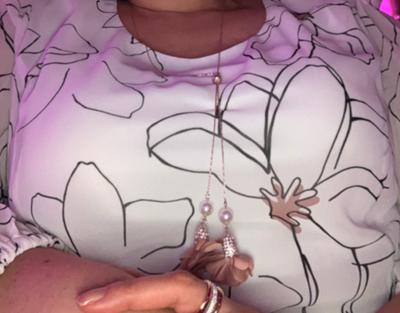 I wasn't sure that I would like the fabric flower part of the necklace - and I don't like it - I LOVE it! Fun, frilly, casual or dressy, depending on what you wear it with. The necklace. is a great length and gets lots of comments. This necklace can be adjusted to be a short necklace with long tassels or a long necklace with short drops. Darling!