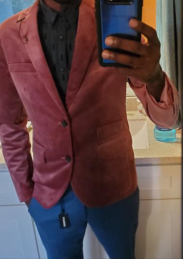 Very soft and warm Blazer, is so nice for parties and gatherings. It can be worn over Jeans as well as on formal nights too. The texture is velvet soft and plush. Color is great... not too ugly pinkish or like that but peachish and elegant. The tailoring is elegant, the style touch for the Metal clip/brooche is nice. Love it ... Just make sure you check the size, this is Slim fit so if you like relaxed fit then take a size larger.