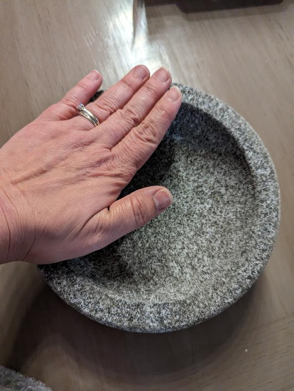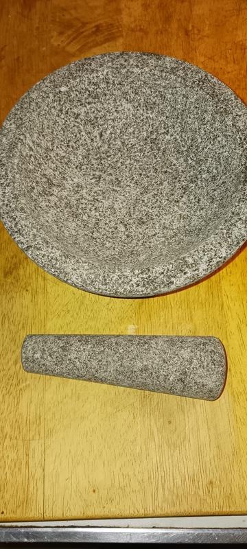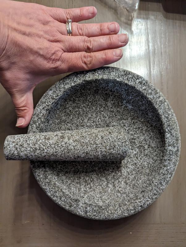I received this granite mortar and pestle set in exchange for my review. The first thing I noticed about this set was the shear weight. It is a hearty product, makes sense as it’s granite. The mortar has quite a large dish to work in and make larger amounts of anything I wish. The cleanup is super simple and quick. We love our new kitchen tool and use it all the time!
