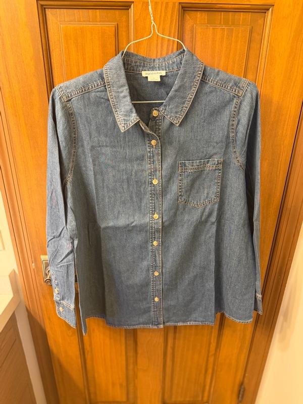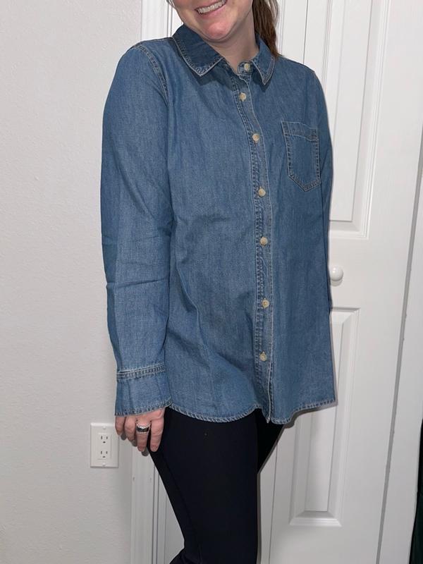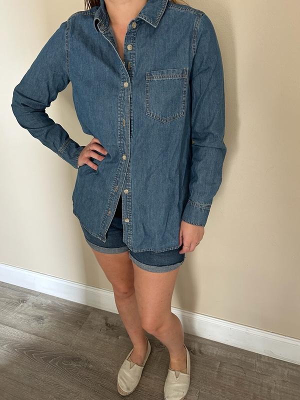 This denim shirt is so comfortable and the material is so soft. The shirt got here as I was trying to figure out what to wear to birthday brunch and this worked perfect with my dress since it is a little chilly. The buttons are easy to work and the design is perfect to wear either over a dress or as a top. Great fit