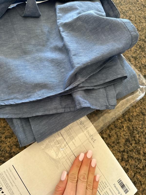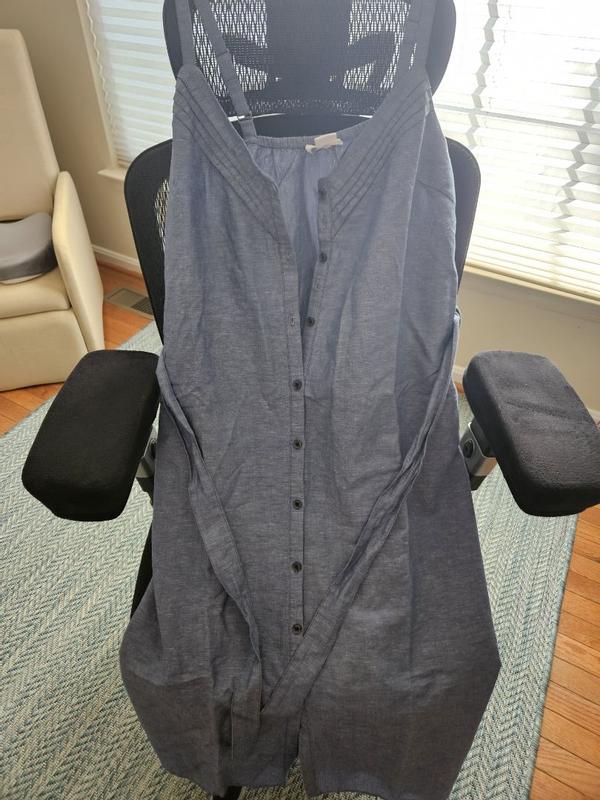 The dress I got is DREAMY!!!! I love the chambray color it is so beautiful, The fit is great as well. Fabric is lightweight yet durable. I washed it in cold setting and let it air dry. It needs some ironing after. So so happy with the dress! I got the size small and I think I could have gotten away with an extra small. No need to size up! It is very roomy and does not put any pressure on the belly
