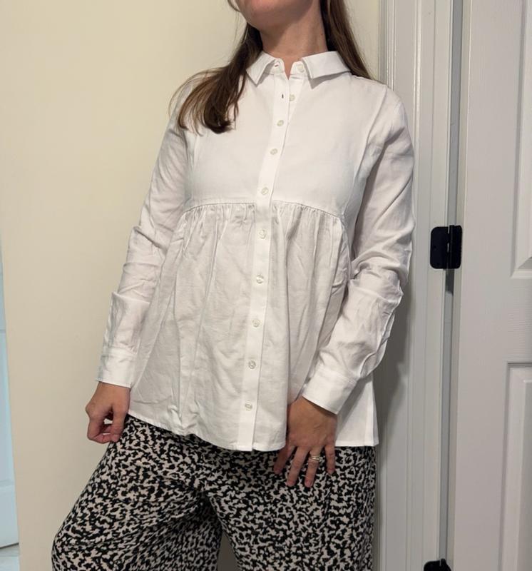 This is a really nice quality button down shirt and would be great with a full-size bump! I'm currently nursing so the buttons are nice for easy access. The stitching in the front is slightly uneven but it is still a really great shirt. Runs true to size.