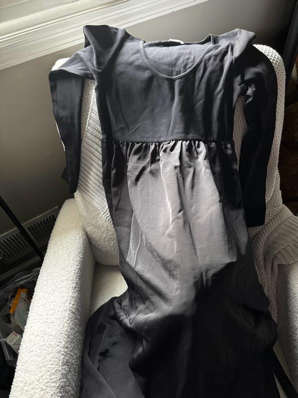 Modern lines, effortless movement. The Mixed Media Dress features a fitted stretch-knit bodice and a fluid woven skirt for a refined silhouette that s made to grow with you. The scoop neckline and long sleeves keep things clean and versatile, while the easy midi length makes it a wear-anywhere staple—perfect for the office, a dinner out, or anything in between.