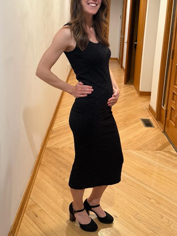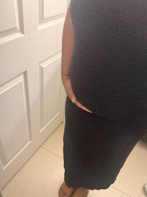 Super cute dress! I am 5’6” and I am wearing a small for reference. I typically wear an extra small, but sized up so I will have plenty of room to grow. I love how it can stretch so you can wear it throughout the year. It is lightweight and breathable which will be great for summer months. I love the long length which is very flattering. I would highly recommend this dress!