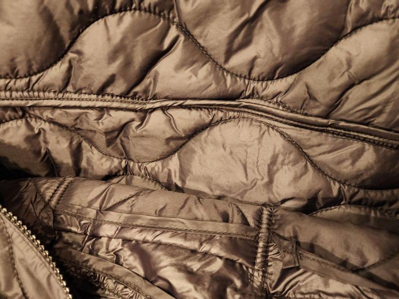 Really nice, lightweight jacket. Comfortable, lightweight but cozy and warm. Convenient deep pockets so nothing falls out. Love the drawstring hood so you can pull it right around your face. I felt that the chest area was tight relative to the bottom part, even fully zipped, was spacious.
