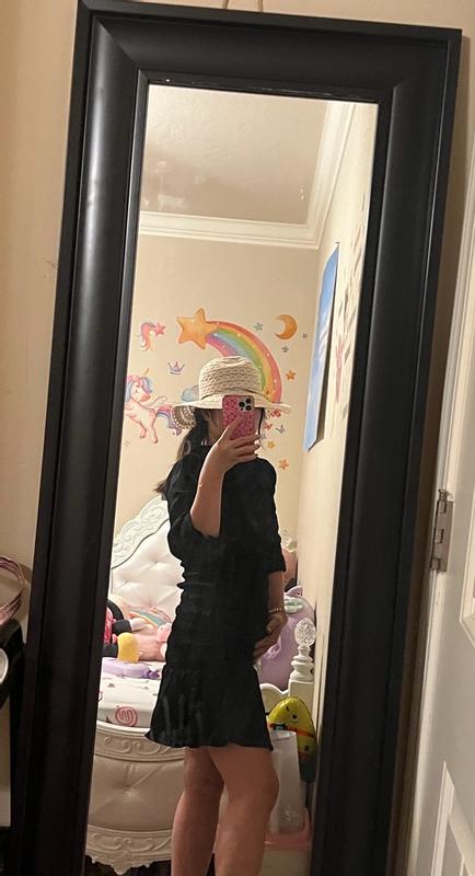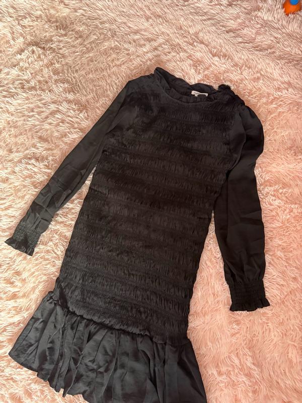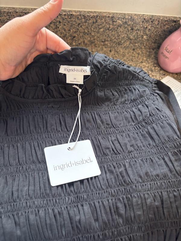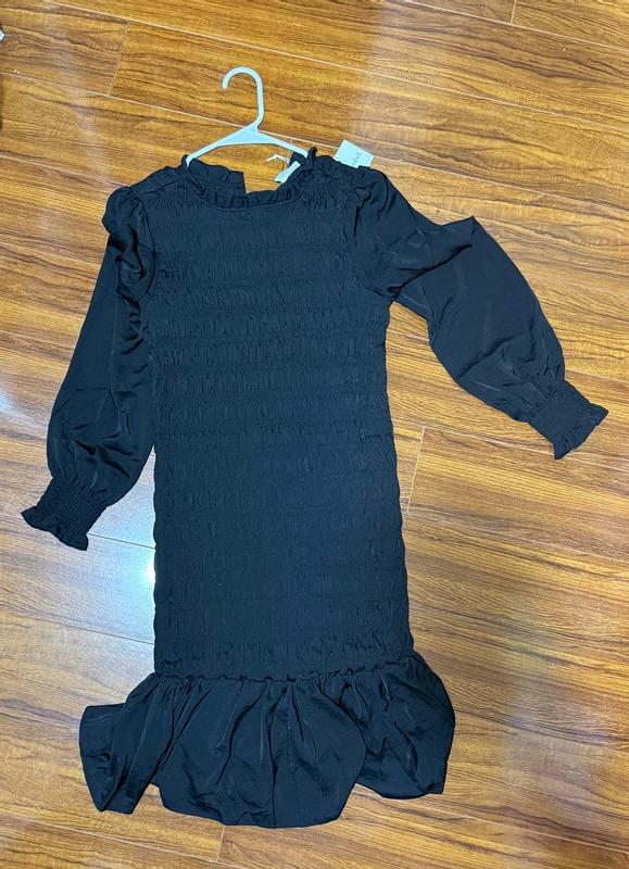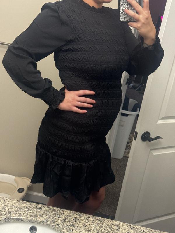 Ingrid+Isabel "The RSVP Mini Maternity Dress" This dress is designed to be worn throughout pregnancy and even after childbirth. • Design: • Long-sleeved dress with a fully smocked bodice for flexible stretch to accommodate changing body shape. • Made from lightweight yet luxurious sateen fabric. • Features billowy sleeves and a ruffled hem for a feminine touch. • Versatility: The dress length is slightly above the knee, suitable for various occasions such as baby showers, celebrations, or evening outings.