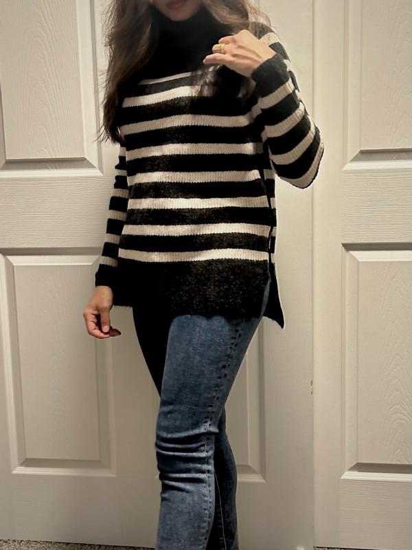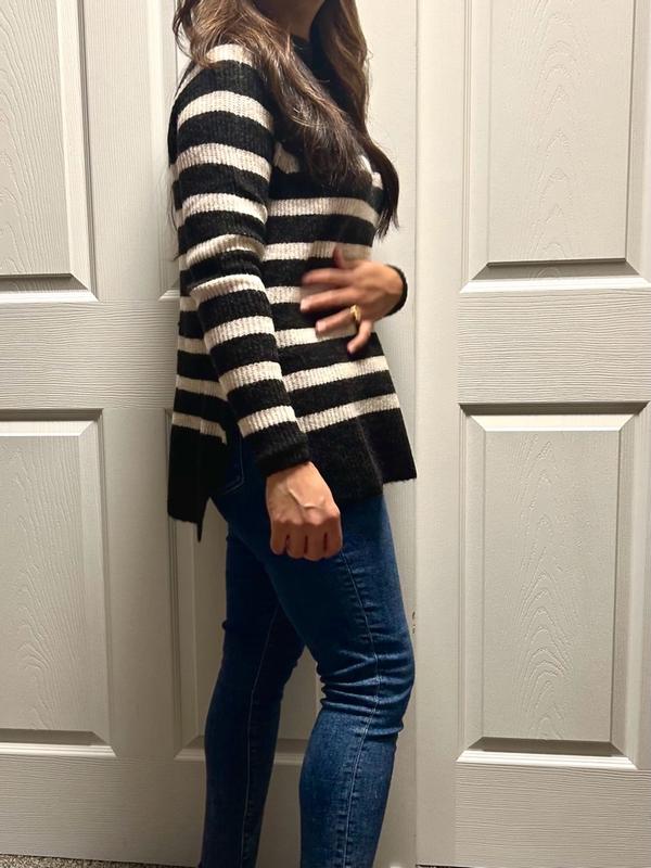 Pretty sure I claimed a medium in this sweater but I received an XS. I was actually surprised when it fit me lol. It’s a mock turtle neck style so the neck portion was a bit hard to get over my head but once I got it on, it stretched and fit. Since it’s two sizes smaller than what I picked, it was a bit snug but it is quite stretchy so it still fit but not with much room. The material is super soft, almost velvety but I wouldn’t necessarily call it the best quality or not durable material. It seem very delicate and I’m not sure how it will hold up if it were to get caught on something or how it will hold up in the wash so I’m curious to see when I wash it. I obviously won’t put it on the dryer. I do like the zipper feature on the size, making it easy to nurse my baby and the sweater is perfect for the fall and chilly months. I do wish it were a little bit longer but given that it’s not my size, that may be why. Overall, it’s a nice sweater but I’m not quite sure I’d pay the original price for it.