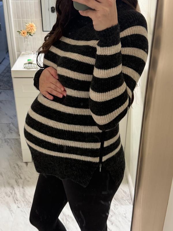 This sweater is incredibly soft and stretchy, making it a comfortable option during pregnancy. The fabric feels gentle overall, though I did notice it can be a bit itchy in the arms. The stretch works really well to accommodate a growing bump, and the zippered sides are a thoughtful detail that allow for extended wear throughout pregnancy and even after. One thing to note is that it isn’t very long, so as your bump gets bigger it may ride up a bit. Overall, it’s a versatile and cozy piece with smart design features that make it great for maternity wear.